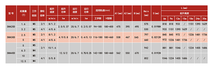 SHA XD低建筑高度鋼絲繩電動葫蘆技術參數: